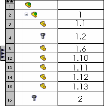 Разъединение элементов в спецификации позволяет удалять отдельные родительские компоненты внутри структурированной иерархии, сохраняя при этом дочерние компоненты. Нажмите правой кнопкой мыши ячейки в столбце спецификации «Структура сборки», чтобы разъединить выбранные узлы сборки или сварные детали, делая их невидимыми в спецификации.