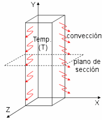 La figura muestra un ejemplo de un bloque largo de aluminio que se mantiene a una temperatura uniforme y se expone repentinamente a un entorno de convección. Puede crear una sección paralela al plano XZ y, a continuación, aplicar una temperatura uniforme a la sección transversal y una carga de convección a la arista externa del rectángulo.