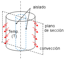 La figura muestra un emplo de un cilindro vacío aislado en la superficie interna y expuesto a un entorno de convecció en la superficie externa. Puede seleccionar cualquier plano de sección en el que esté el eje de revolución.