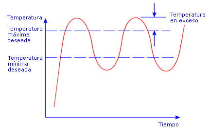 Si el termostato funciona correctamente, el gráfico de temperatura versus tiempo en la ubicación del termostato debe oscilar según se muestra en la figura de abajo, siempre que utilice el tiempo de solución apropiado. Si el sobreimpulso de temperatura en uno o ambos lados de los límites es grande, entonces modifique las propiedades del estudio a fin de poder usar menos tiempo y volver a realizar el estudio.