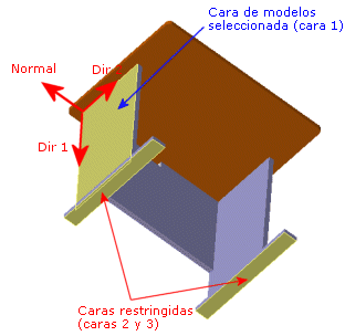 Se puede usar la cara 1 del modelo como referencia para establecer en cero el movimiento de las caras 2 y 3 a lo largo de la cara en dirección 1 (Dir. 1). Las otras dos direcciones (Dir. 2 y Normal) deben quedar sin especificar.