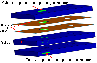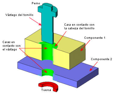 puede conectar dos componentes, varios componentes o un componente y la tierra. Puede definir pernos a través de una pila mixta de sólidos, vaciados y sólidos de chapa metálica. También puede definir un perno si selecciona entidades del mismo componente.