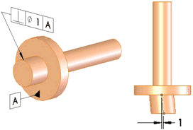 The pin and hole axes align concentrically. The face of the flange, datum plane A, acts as a stop to establish a single point of contact with the top of the plate.