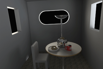 Le caustiche dirette sono visibili solo nel rendering finale e solo quando vengono riflesse da un aspetto pavimento o dalla geometria fisica utilizzando una luce a fascio concentrato o puntiforme. La luce rimbalza o viene filtrata attraverso il modello creando uno schema luminoso sul pavimento.