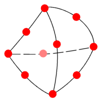 Elemento tetraédrico. Os pontos vermelhos representam os nós do elemento. As arestas do elemento podem ser curvas ou retas