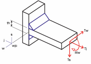 As trações de solda são resolvidas em coordenadas de garganta de solda, como mostrado. A área da garganta da solda é concentrada na raiz.