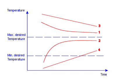 Se a temperatura no local do termostato se aproximar de um dos limites de temperatura com uma inclinação sem cruzá-la (como nas curvas 3 e 4), aumente o tempo da solução e reinicie o estudo.