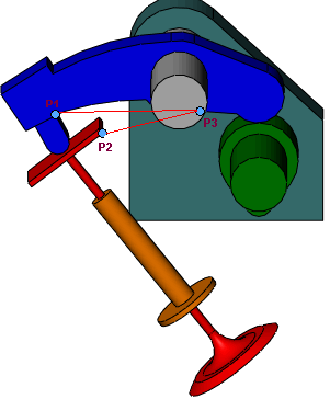 • Selecione três pontos não colineares para um ângulo que especifica um resultado de deslocamento angular, o que calcula o movimento do ângulo conforme os pontos se movem com a montagem. Selecione os primeiros dois pontos em peças separadas e o terceiro ponto para especificar o ângulo inicial entre os pontos.