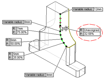 É possível atribuir valores de raio a qualquer número de pontos de controle ou deixá-los como não-atribuídos. Filete de tamanho variável aplicado