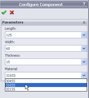 Um PropertyManager torna fácil a seleção da configuração adequada quando você insere um componente em uma montagem. Quando você insere o componente, o PropertyManager é aberto e você seleciona uma configuração com base nos parâmetros do modelo. Mais tarde, se você precisar mudar para outra configuração, pode abrir o PropertyManager novamente e selecionar outros parâmetros de modelo. |