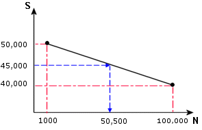Curva Linear SN. Os eixos X e Y representam, respectivamente, o número de ciclos e a tensão. Com o valor de tensão 45.000 psi, o programa executa a interpolação linear e calcula o número de ciclos como 50.500.