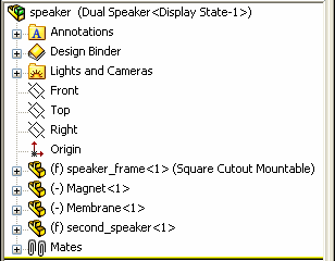 • No topo da árvore de projetos do FeatureManager, clique com o botão direito no nome da peça, montagem ou desenho e selecione Exibição em árvore > Exibir nomes de configuração de componentes.