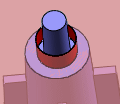在影像中,結合面是蓋子的底部 (透明)。 會根據結合面自動計算填料高度。 綠色強調顯示的邊線會顯示滿足填料的結合面。 螺柱銷會貫穿蓋子。