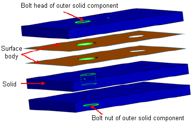 can connect two components, multiple components, or a component and the ground. You can define bolts through a mixed stack of solids, shells and sheet metal bodies. You can also define a bolt by selecting entities of the same component.