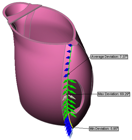 Maximum deviation Identify problem areas along the edges of sweeps, lofts, or surface fills where there is maximum deviation.