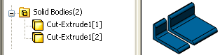 The number of solid bodies in the part document appears in parentheses next to Solid Bodies . If several bodies are created from the same feature, an instance number appears in square brackets after each instance listed in Solid Bodies . For example, the following part contains two solid bodies created by one extruded cut: