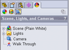 The DisplayManager lists and provides editing access to appearances, decals, scene, lights, and cameras that are applied to the current model. When PhotoView 360 is added in, the DisplayManager provides access to