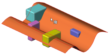 • Select bodies. The surface cuts only the bodies you select using the pointer. If you add new bodies to the model that are intersected by the cutting surface, right-click, select Edit Feature, and select those bodies to add them to the list of selected bodies. If you do not add the new bodies to the list of selected bodies, they remain intact.