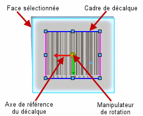 L'axe de référence du décalque reste à l'origine de départ du décalque, même lorsque le décalque est déplacé. Le manipulateur de rotation se déplace avec le centre du décalque.
