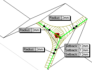 Aperçu intégral d'un congé décalé avec la même Distance de décalage, 12 mm, appliquée aux trois arêtes. Aperçu intégral d'un congé décalé avec une Distance de décalage différente appliquée à chacune des trois arêtes.