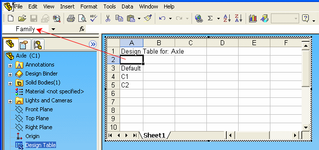 Lorsque vous sélectionnez Création automatique ou Vide dans le PropertyManager Table des scénarios, le logiciel SolidWorks crée automatiquement le fichier Excel. Les familles de pièces créées automatiquement incluent la cellule Family (Famille).