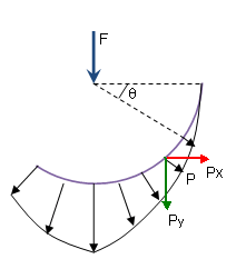 Vous appliquez le chargement indiqué comme F. Le programme transfère le chargement sur chaque nœud le long de la circonférence des arêtes sélectionnées ou de la coupe transversale des faces sélectionnées sous la forme Fo sinΘΘ. La figure montre la composante x et y du chargement transféré par les flèches rouges et vertes. La valeur de Fo est déterminée par l'équilibre des forces.