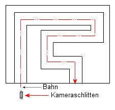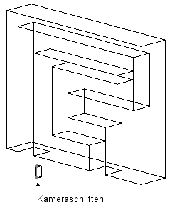 • Der Kameraschlitten ist ein Modell eines Raumschiffes mit einer Linie (verdeckt) und einem Punkt.