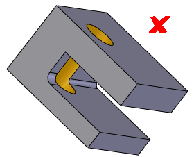 ドリル穴と他のキャビティ部分の交差は避けてください。 機械加工の間に、キャビティと交差するとき、ドリルは最少抵抗のパスをたどります。 ドリルが材料に再び切り込むとき、ドリルはぶらつくかもしれません。 穴がキャビティを横切らなくてはならない場合、ドリル軸はキャビティの外になければなりません。