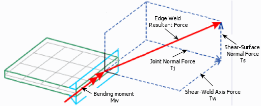 Os resultados da solda de aresta são calculados para todos os nós da malha na aresta de interseção da peça terminada. Os resultados são calculados em relação a um sistema de coordenadas local estabelecido em cada nó, como mostrado na figura.