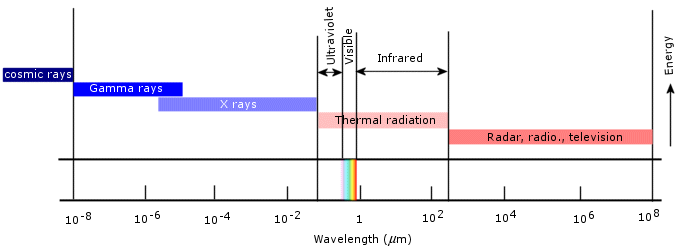 Radiação térmica é a energia térmica emitida por corpos na forma de ondas eletromagnéticas devido à temperatura. Todos os corpos com temperaturas acima do zero absoluto emitem energia térmica. Como as ondas eletromagnéticas se deslocam no vácuo, nenhum meio é obrigatório para que a radiação ocorra. A figura a seguir mostra o intervalo, em comprimentos de onda, da radiação térmica comparada a radiações emitidas por outros meios (raios-x, raios-g, raios cósmicos, etc.)
