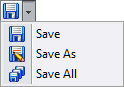 Clique na seta para baixo ao lado de um botão de ferramenta para expandi-lo e exibir um menu flyout com funções adicionais. Isto permite acessar a maioria dos comandos do menu Arquivo a partir da barra de ferramentas. Por exemplo, o menu flyout Salvar inclui Salvar, Salvar como e Salvar todos.