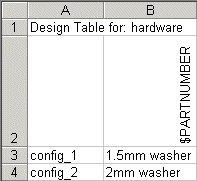 Em uma tabela de projeto, o parâmetro $PARTNUMBER permite especificar um valor diferente para a coluna Nº DE PEÇA da BOM. Em um documento de montagem, este é o número de peça usado quando a configuração aparece na BOM como uma submontagem. O cabeçalho da coluna usa esta sintaxe: