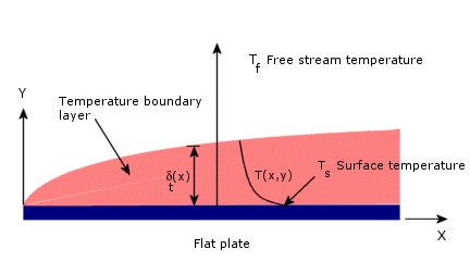 Um esboço semelhante poderia ser feito com a transição de temperatura, da temperatura da superfície para a temperatura ambiente. Um diagrama da variação de temperatura é mostrado na figura seguinte. Observe que a espessura da camada limite térmica não é necessariamente igual à do fluido. As propriedades do fluido que faz com que o número de Prandtl controle a magnitude relativa de dois tipos de camadas de limite. Um número de Prandtl (Pr) igual a 1 indicaria o mesmo comportamento para ambas as camadas.