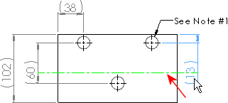 Arraste uma nota e aplique "snap" ao texto da dimensão, como indicado pela linha de inferência pontilhada. |