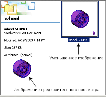 Используйте Проводник Windows для просмотра уменьшенных копий изображений, а также чтобы получить доступ к информации о свойствах пользователя для документов SolidWorks.