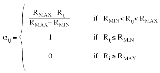 Расстояние Rij находится между определенным пользователем RМИН. и RМАКС. ( RМИН. < Rij < RМАКС.). Степень корреляции является постоянной для RМИН. меньше или равного Rij и уменьшается в линейной зависимости для интервала RМАКС. - RМИН.. |