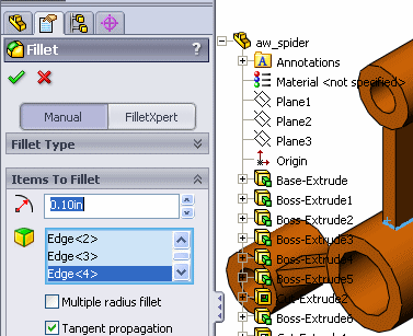Нажмите в строке заголовка окна PropertyManager, чтобы открыть плавающее дерево конструирования FeatureManager в графической области.