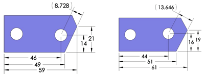 Con la utilización de TolAnalyst, cree un estudio para determinar la pila de tolerancia para una medición definida desde el plano de la derecha al taladro de la derecha, que muestra la cota de referencia 11,18. La ubicación del plano es controlada por dos operaciones construidas, líneas de intersección, que se muestran mediante los círculos rojos.