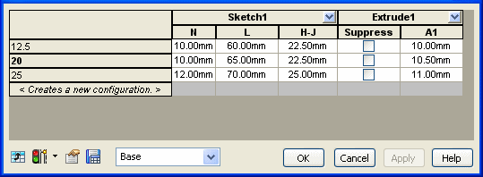 El cuadro de diálogo Modificar configuraciones brinda una tabla donde puede crear y modificar configuraciones de los parámetros que se configuran habitualmente en piezas y ensamblajes.