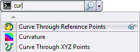 Con una pieza o un ensamblaje abiertos, escriba curva por puntos de referencia en Buscar comandos. Tan pronto como haya escrito cur, la lista de resultados mostrará únicamente los comandos que incluyan la secuencia de caracteres "cur"; Curva por puntos de referencia aparece en las posiciones superiores de esta lista.