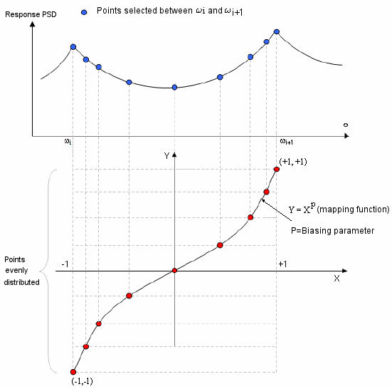 La siguiente figura muestra la distribución de frecuencias a las que se calcula la solución para estudios de vibración aleatoria.