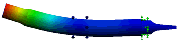Las imágenes muestran dos formas deformadas de un eje con una sujeción de rodamiento. Se aplica una carga remota vertical a uno de los lados. Se aplica un conector de apoyo sobre una cara cilíndrica dividida del eje.