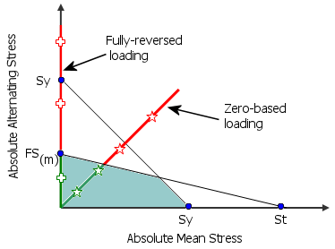 The blue and red regions of the fatigue check plot are determined from the diagram below. For each node, the program calculates the alternating and mean stresses based on the defined fatigue event type.