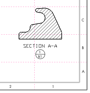 In this section view example, Sheet 1 shows the parent view and Sheet 2 shows the child view. The zone is determined by the centroid of the view. The location label on the parent view shows where the child view is located, Sheet 2 - Zone C1. The location label on the child view shows where the parent is located, Sheet 1 - Zone B1.