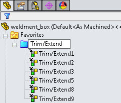 For example, to allow for proper weld dimensions and the strongest possible weld penetration, you can specify a weld gap in the Trim/Extend features that you add to a weldment part. You can group these features in a Trim/Extend subfolder for quick visual access, to create configurations, and to check your design.