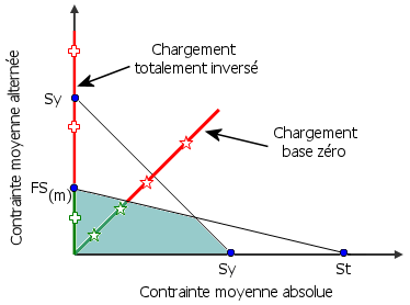 Les zones bleues et rouges du tracé de contrôle de la fatigue sont déterminées par le diagramme ci-dessous. Le programme calcule les contraintes alternées et moyennes pour chaque nœud en fonction du type d'événement de fatigue défini.