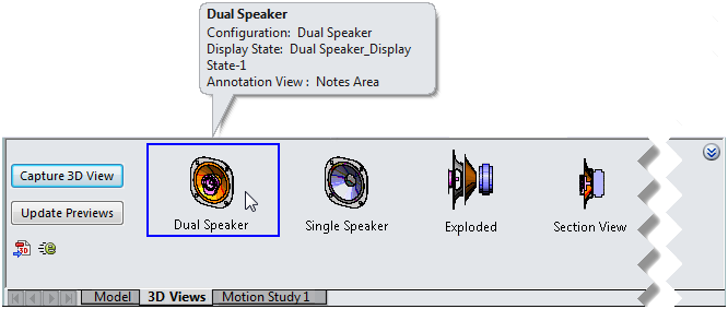 Lorsque vous capturez une vue 3D, le nom de la vue et un aperçu sont ajoutés à l'onglet Vues 3D. Pour voir les détails de la vue, placez le pointeur sur son aperçu. Pour changer de vue, double-cliquez sur une vue. La vue est présentée et l'affichage dans la zone graphique change pour correspondre à la vue sélectionnée.