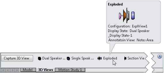 Capturer la vue 3D ouvre le PropertyManager Capturer la vue 3D, qui vous permet d'indiquer le nom de la vue 3D, ainsi que la configuration, l'état d'affichage et la vue d'annotation à capturer.