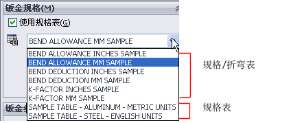 可以使用钣金规格表指定整个零件的默认值。