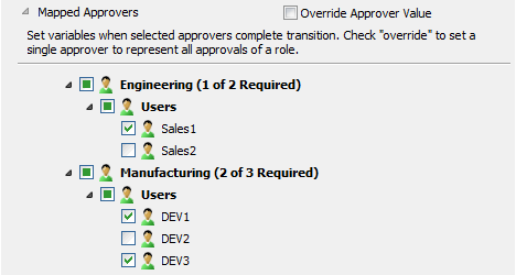 如果您选择覆盖审批者值,则单选按钮将取代复选框,并且您只能选择一个用户。